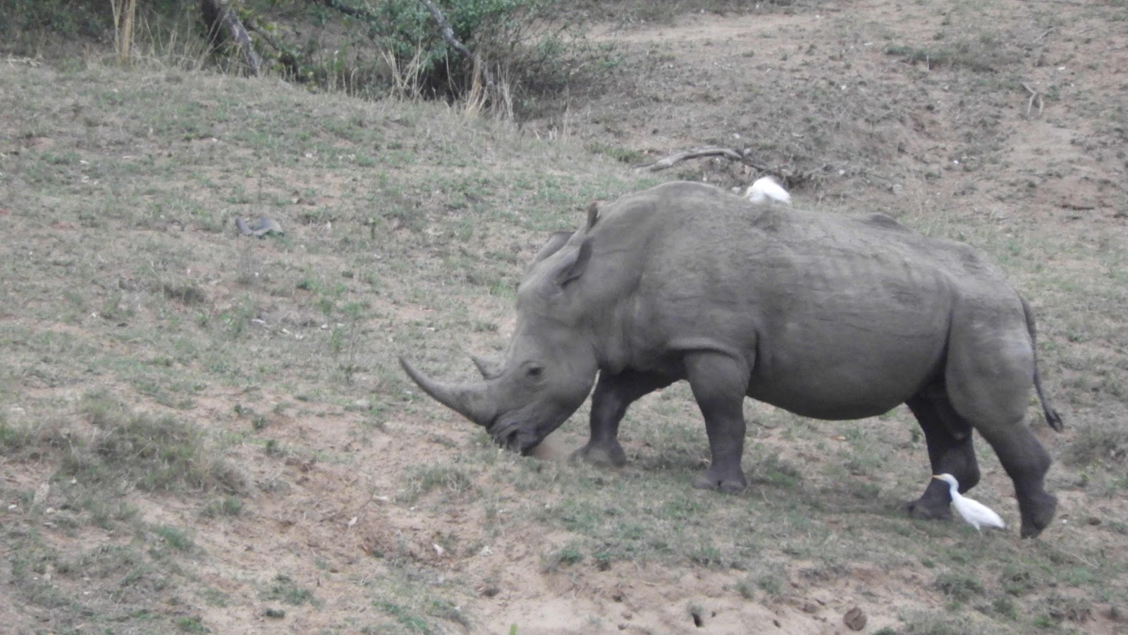 5u30 in Malalane. 't Is al klaar. Nog even omdraaien en blijven liggen of ... toch snel naar de tuin en de Krokodilrivier overschouwen? Je weet nooit, dus ... doen! En zie, ik kan mijn slaapogen bijna niet geloven: een nijlpaard keert juist terug van zijn nachtelijke graaspartij, stapt het water in en glijdt zijn vertrouwde habitat in. Op een paar 100 meter van waar ik sta. Snel, foto nemen, maar op zo'n afstand schiet de telelens te kort. Betty wakker maken. Dan komt in de verte een witte neushoorn aangewandeld - "weide renoster" in het Afrikaans - begeleid door twee witte koereigers en verschillende ossenpikkers - "rooibek renostervoëls". De neushoorn passeert gelukkig wel binnen het bereik van de lens. Af en toe hoor je het "whoesssch-geluid" van de hippo in het water. Maar waar zijn de waterbucks van gisteren gebleven? Spoorloos verdwenen. Nu misschien toch eerst een vroeg ontbijt klaar maken?