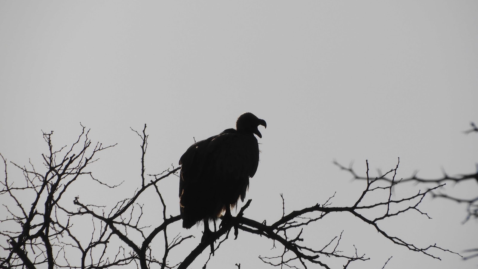 Ndlovu kamp ligt aan de ingang/receptie van Hlane. Daar rijden we nu - opnieuw 6 uur ‘s morgens - naar toe en ... voorbij. Vandaag exploreren we het zuidelijke deel van Hlane. Maar voor het zover komt steekt onverwachts een jonge, eenzame olifantstier de grintweg over. Dat is schrikkken: stoppen, kijken, foto’s nemen. Alvast een goed begin van onze safari. En dan hadden we net daarvoor nog een gier in een boomtop gespot. Hlane heeft de grootste kolonie “white-backed” gieren van gans zuidelijk Afrika.