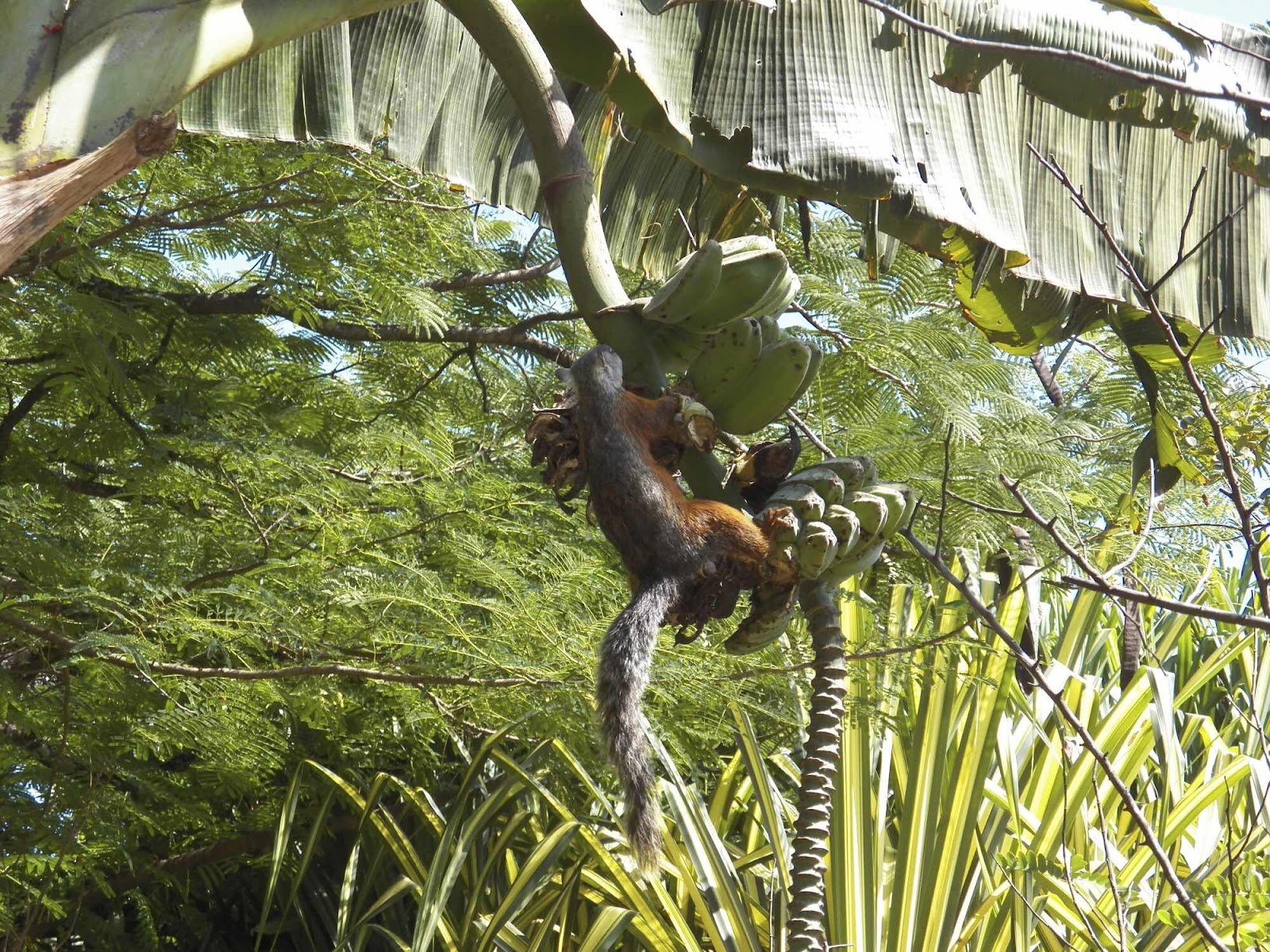 Terug aan “Mona Lisa”. Een eekhoorn zit een tiental meter van ons huis in een boom een vrucht uit te peuzelen. En plots ... ongelooflijk maar waar ... daar komt een toekan aangevlogen. ‘k Heb niet genoeg uitroeptekens om mijn opwinding duidelijk te maken. Fantastische vogel, zoals op de foto’s (maar daarvoor zijn we te laat). Drie, vier collega –toekans komen de eerste vervoegen in de takken. Dan duiken ze samen al klepperend de kloof in. Prachtig! Tijd voor stevig ontbijt: Huevos Pochados maar deze keer met krokant gebakken spek d’er bij en de Desayuno Ranchero: spiegeleitjes met onder andere zwarte bonen. Lekker.